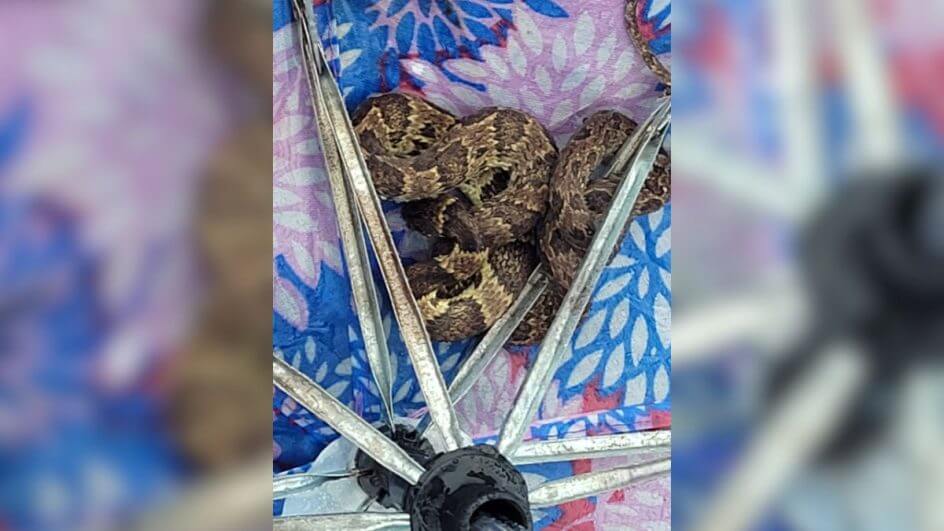 Uma foto feita pela corporação mostra a serpente parcialmente enrolada a uma das hastes de alumínio pelo lado de dentro do guarda-chuva. Ela foi recolhida e levada para uma área de mata.