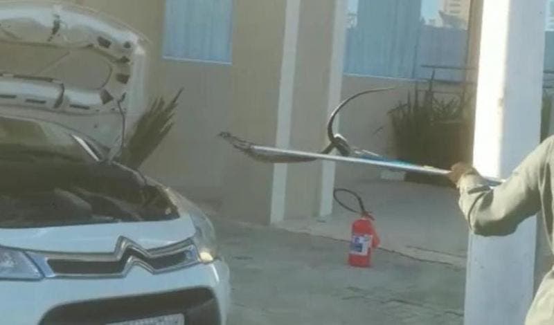 Os bombeiros foram acionados após populares avistarem a cobra subindo pela roda de um carro estacionado em via pública. Ao chegar ao local, os socorristas foram informados que o animal possivelmente estaria no motor do veículo. A proprietária foi chamada e autorizou a abertura do automóvel.