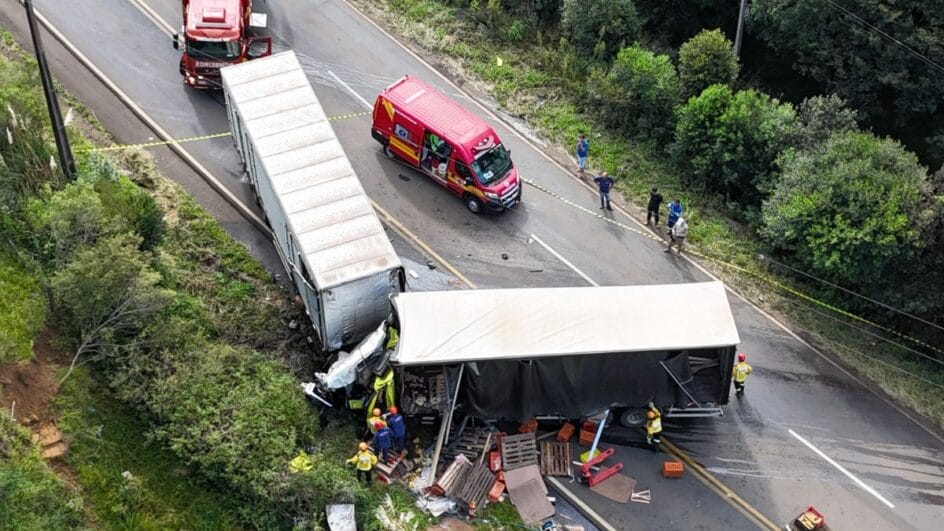 Dois caminhões bateram de frente na SC-350, em Lebon Régis, no Meio-Oeste catarinense, matando os dois motoristas envolvidos. Um deles tinha 26 anos. O outro não foi identificado.
