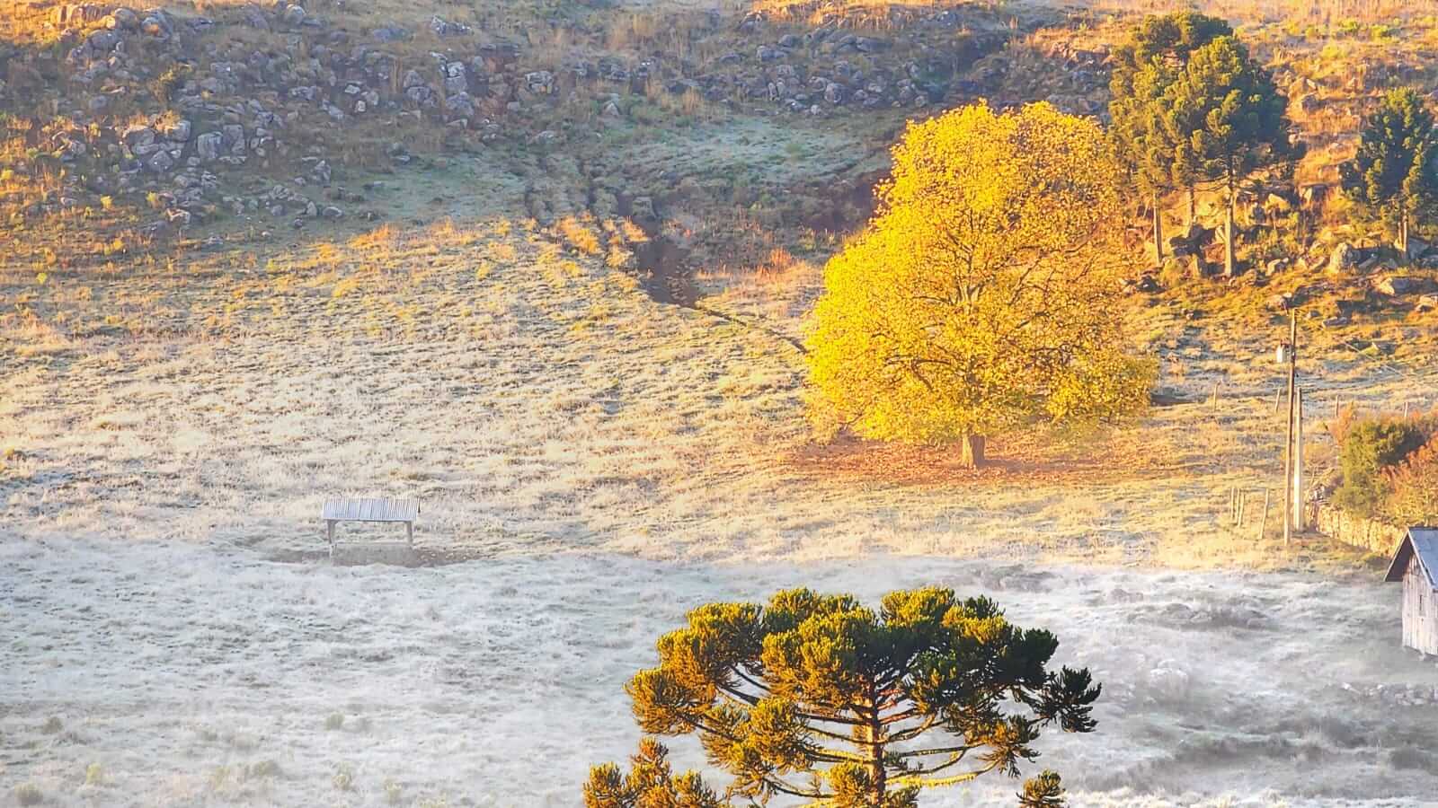 O fenômeno que deixou a vegetação coberta por uma fina camada de gelo aconteceu em São Joaquim, por volta das 7h30min, na localidade do Vale do Caminho das Neves. A área fica a 3 quilômetros do centro da cidade.