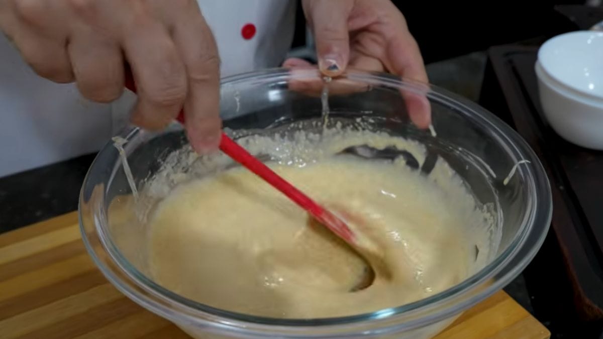 Primeiro, misture os ovos com o farelo de aveia, o sal e o açúcar. Em seguida, acrescente a massa para tapioca e mexa novamente até formar um creme homogêneo.
