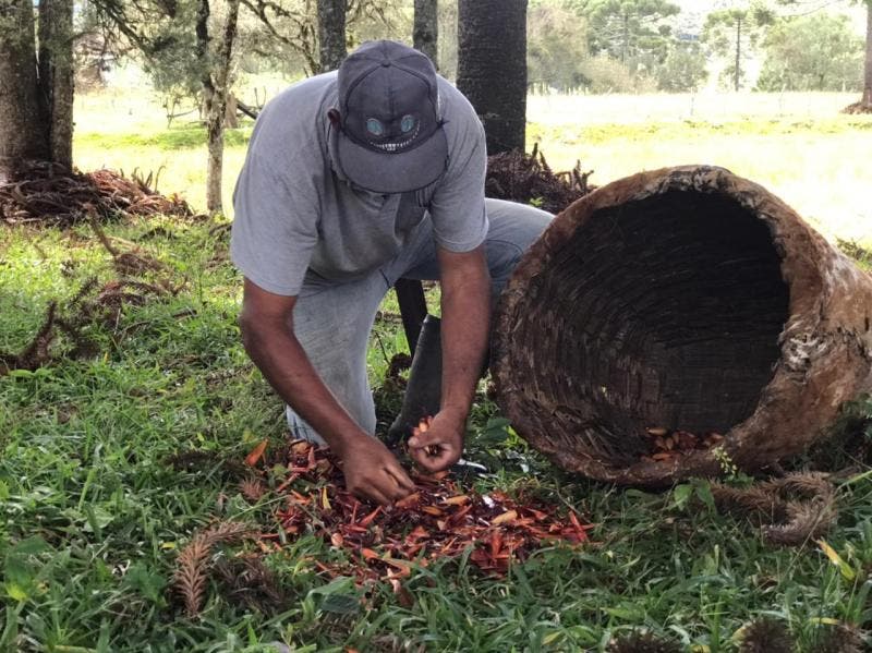 Aos 59 anos, Orlei Arruda Melo deixa para o filho a missão de encarar as subidas nas araucárias. Ele fica no chão, ajudando a encontrar as pinhas com um olho clínico de um produtor experiente. E se no ano passado eles conseguiram colher apenas 40 sacos de pinhão, esse ano a produção deve passar dos 250 sacos.