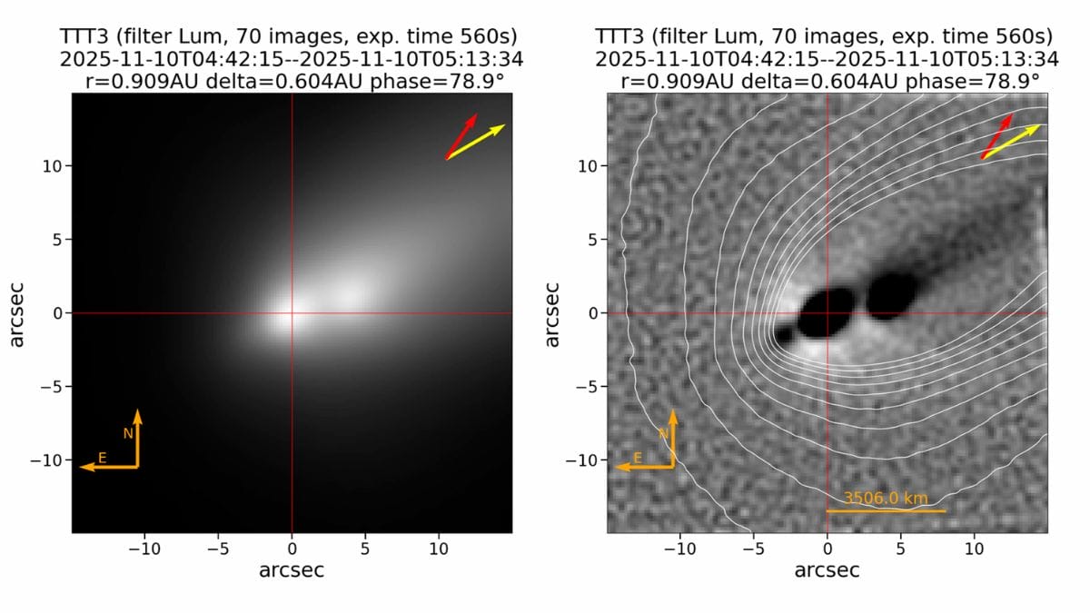 Os astrônomos conseguiram registrar o exato momento em que o cometa C/2025 K1 se partiu em pelo menos três pedaços ao passar perto do Sol. A aproximação com a nossa estrela foi quatro vezes maior ao periélio do 3I/Atlas. O fenômeno aconteceu na madrugada do dia 11 para o dia 12 de novembro, e foi observado pelo Telescópio Copernicus, instalado na Itália.