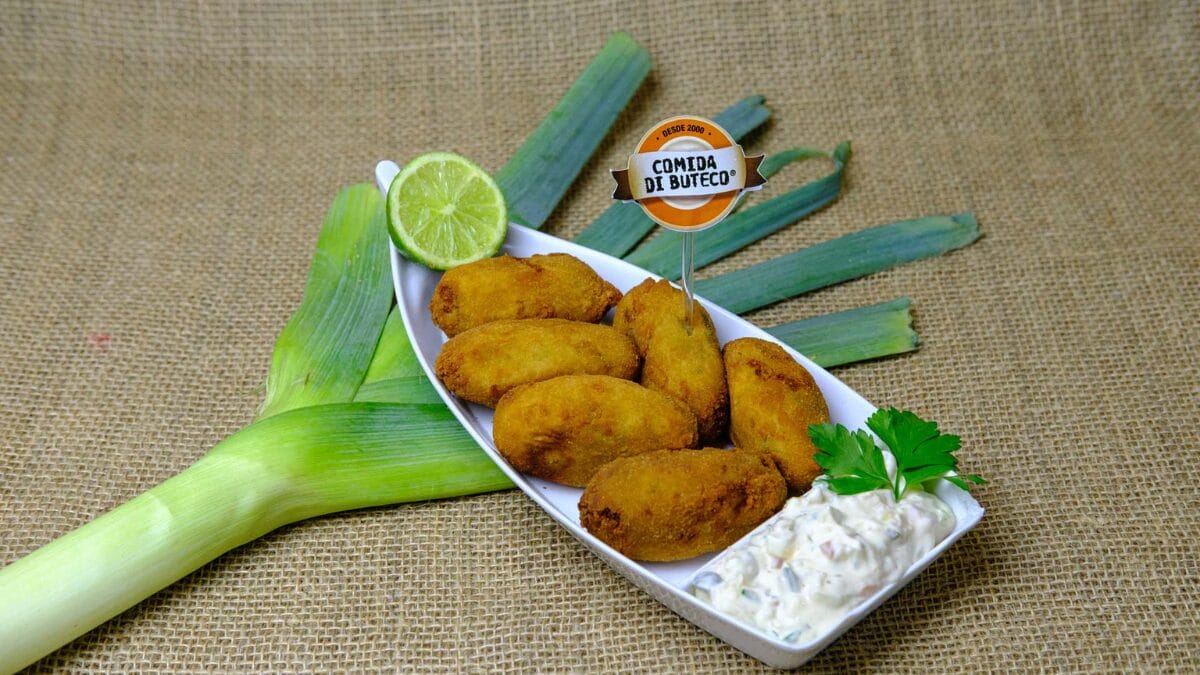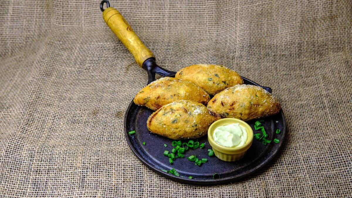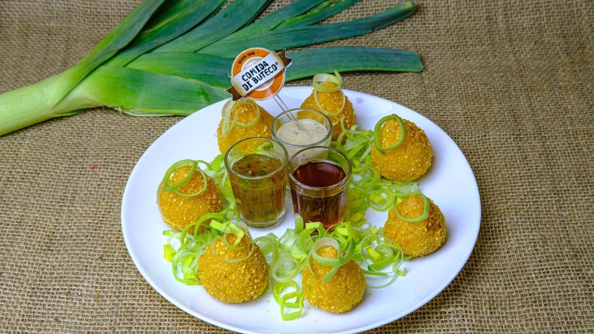 - Coxinhas com massa de milho e recheadas com alho-poró e siri.