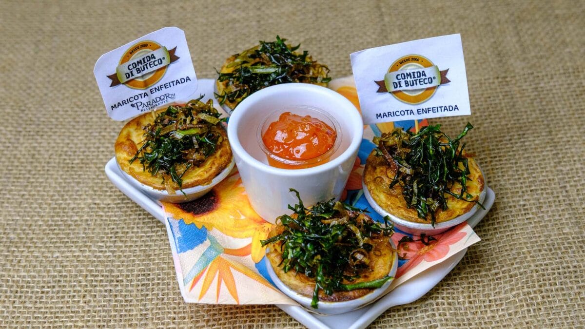- Maricota Enfeitada: minitorta de couve-flor recheada com linguiça Blumenau, mussarela e requeijão cremoso, finalizada com crispy de alho-poró e couve manteiga. Acompanha geleia de pimenta.