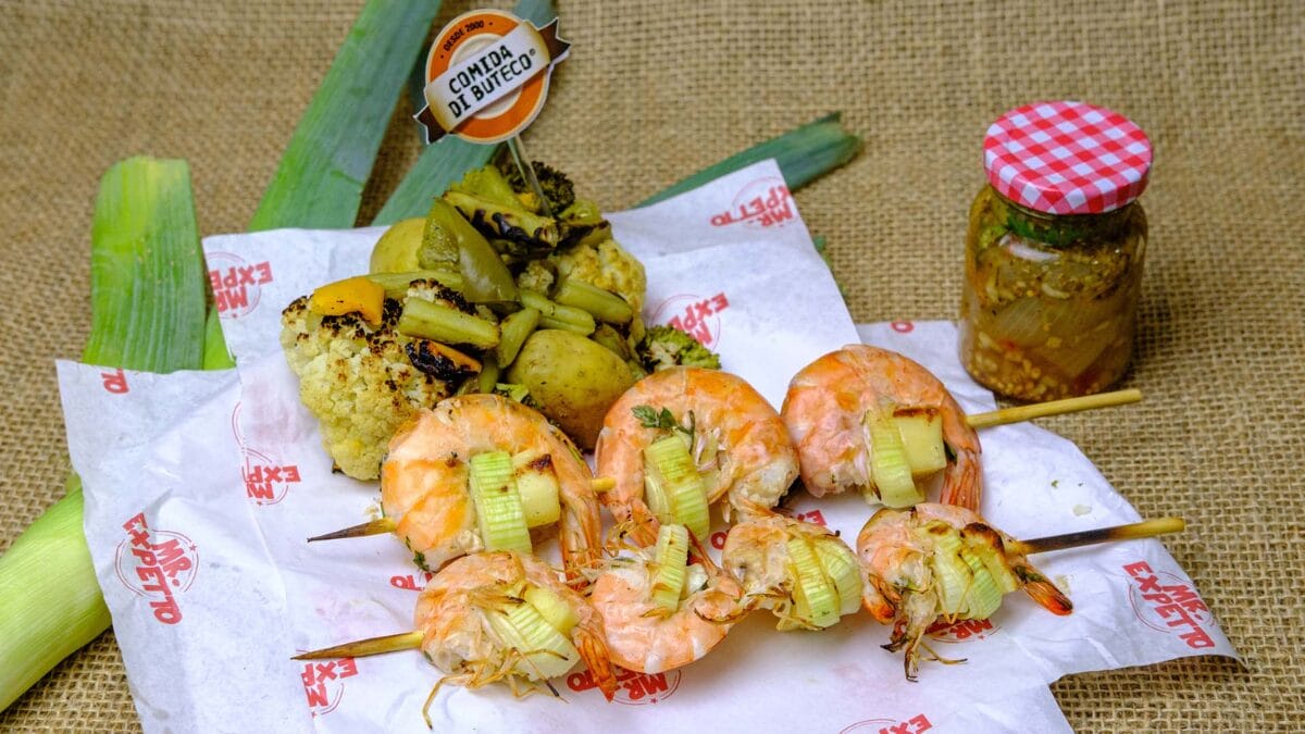 - Camarão alho-lhó-lhó: espetinho de camarão com queijo coalho e alho-poró, acompanhado de verduras defumadas na brasa e compota especial da casa.