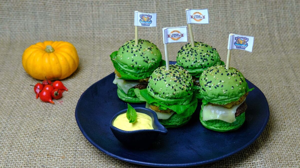 - Mini-hambúrgueres com abacaxi grelhado, bacon e rúcula no pão de espinafre.