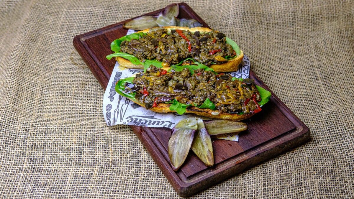 - Caponata de acachofra com pão maltado tostado.