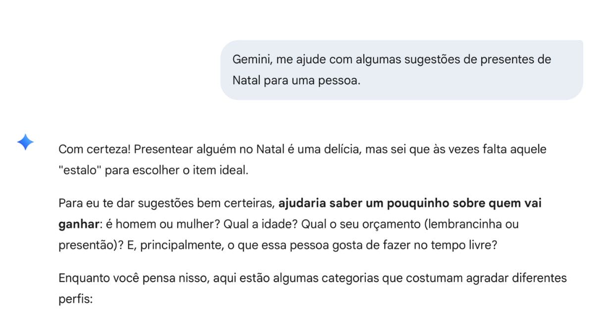 Fizemos o teste com o Gemini, a IA do Google. Definimos algumas características sobre uma pessoa e pedimos pelas sugestões. Veja, na galeria a seguir, as recomendações de presentes de Natal feitas pela Inteligência Artificial.