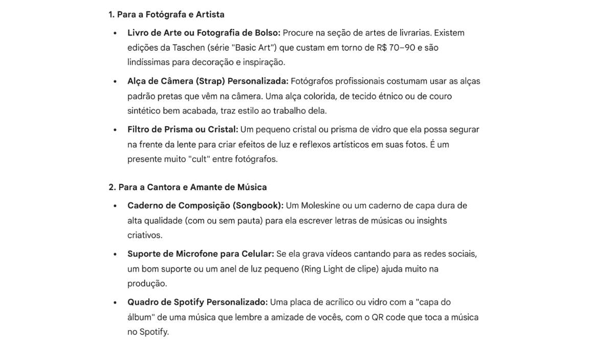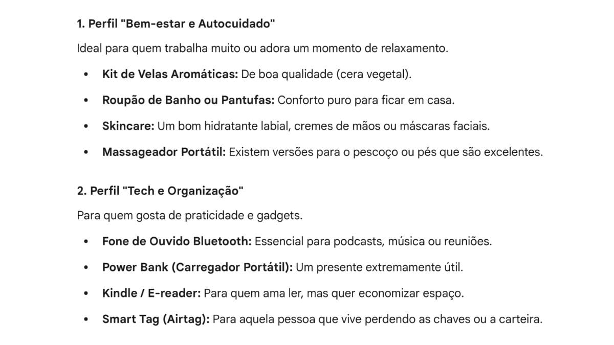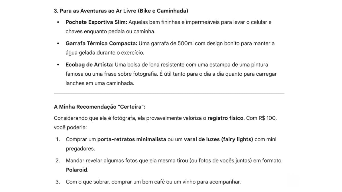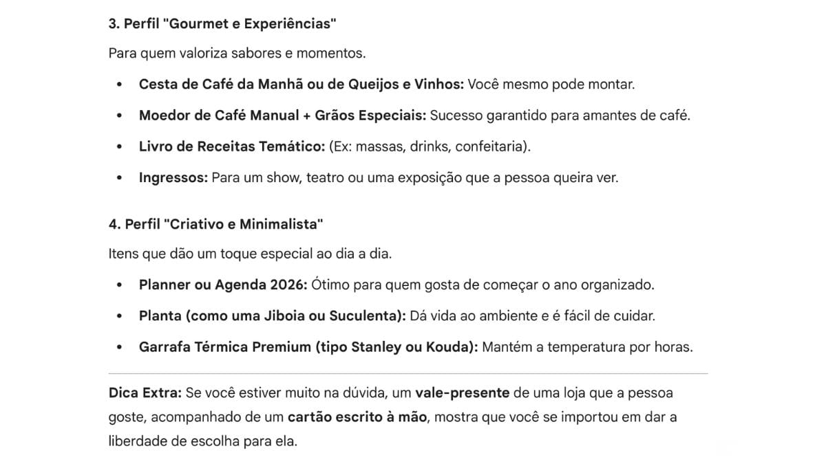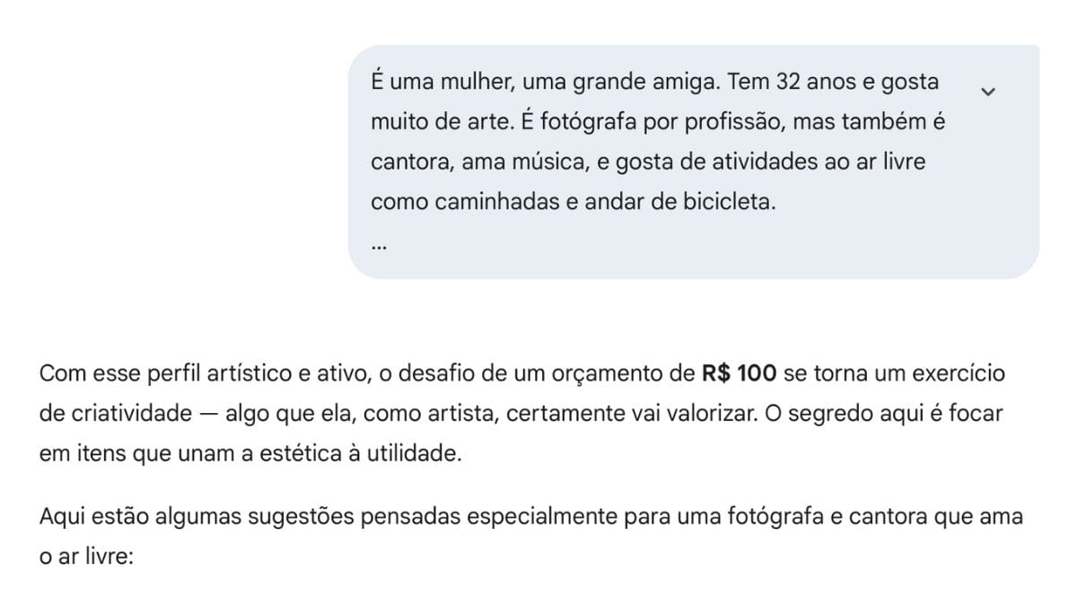 O teste foi feito no Gemini, mas outras ferramentas como o ChatGPT ou a IA de sua preferência, provavelmente, fará o mesmo: sugestões personalizadas de acordo com o perfil da pessoa que você deseja presentear.