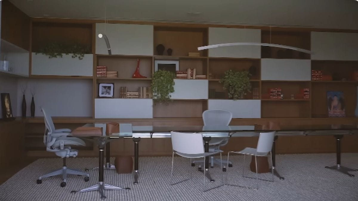 Escritório espaçoso com grande estante de madeira do chão ao teto, mesa de vidro, cadeiras de escritório e plantas decorativas. (Foto: Reprodução, YouTube, Casa Vogue)
