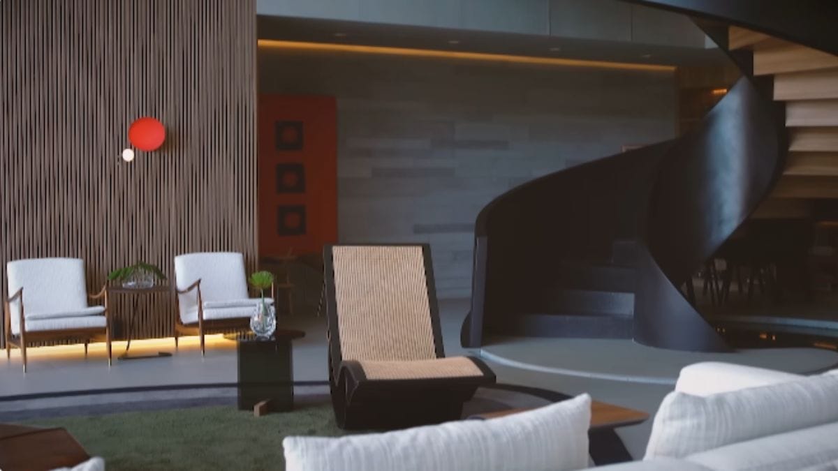 Hall de entrada com escada escultural e tapeçaria artesanal. (Foto: Reprodução, YouTube, Casa Vogue)