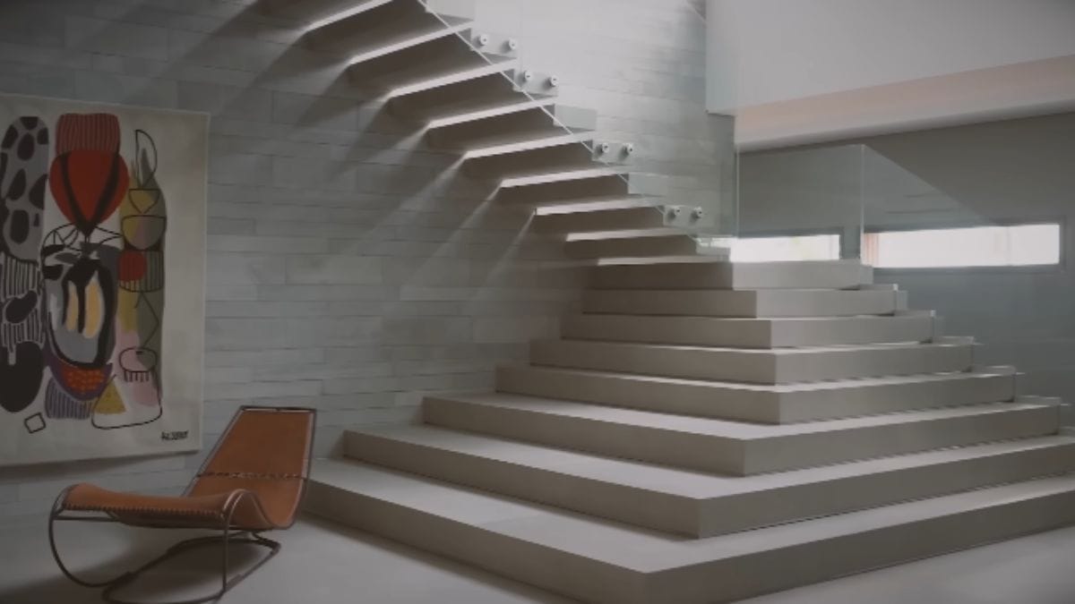Escada de concreto com degraus flutuantes e guarda-corpo de vidro. (Foto: Reprodução, YouTube, Casa Vogue)