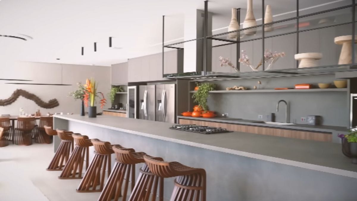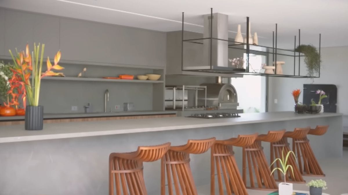 Cozinha gourmet com ilha espaçosa e banquetas de design. (Foto: Reprodução, YouTube, Casa Vogue)