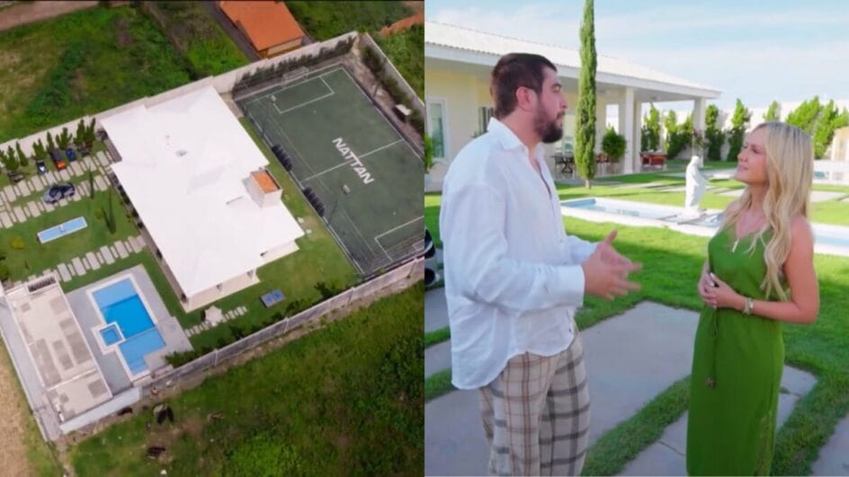 O imóvel tem um campo de futebol, com o nome de Nattan pintado no gramado. A casa tem uma grande piscina e uma área externa pronta para muitos momentos de lazer, com jardim e várias cadeiras, poltronas e espreguiçadeiras. A residência também tem uma mesa para refeições na área externa, onde ele convidou Eliana para almoçar.