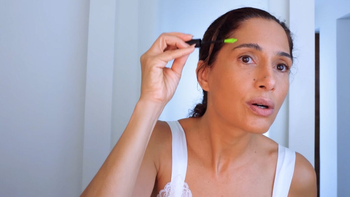 Ela começa a maquiagem com o duo de corretivos Secret Camouflage, de Laura Mercier, para uniformizar o tom da pele, seguido pela base Fluid Foundation Corrector na cor Golden 5.0 Couvrance, da Avéne, que a acompanha há mais de 15 anos.