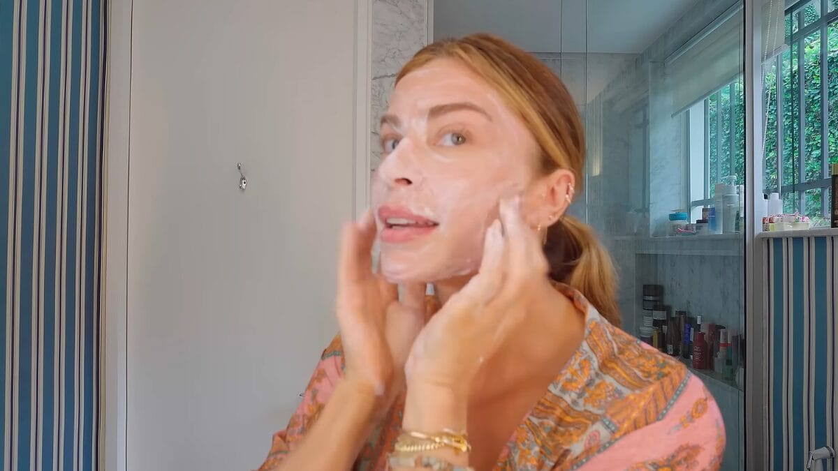 Para o rosto, a atriz não abre mão de uma higienização profunda seguida por hidratação intensa com produtos das linhas Chanel e Shiseido, finalizando sempre com protetor solar em um tom levemente acima de sua pele para garantir um efeito dourado constante.
