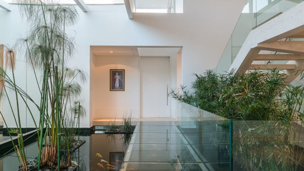 A entrada da mansão impressiona com pé-direito duplo e uma passarela de vidro sobre espelho d’água (Foto: StudioHub, Divulgação)