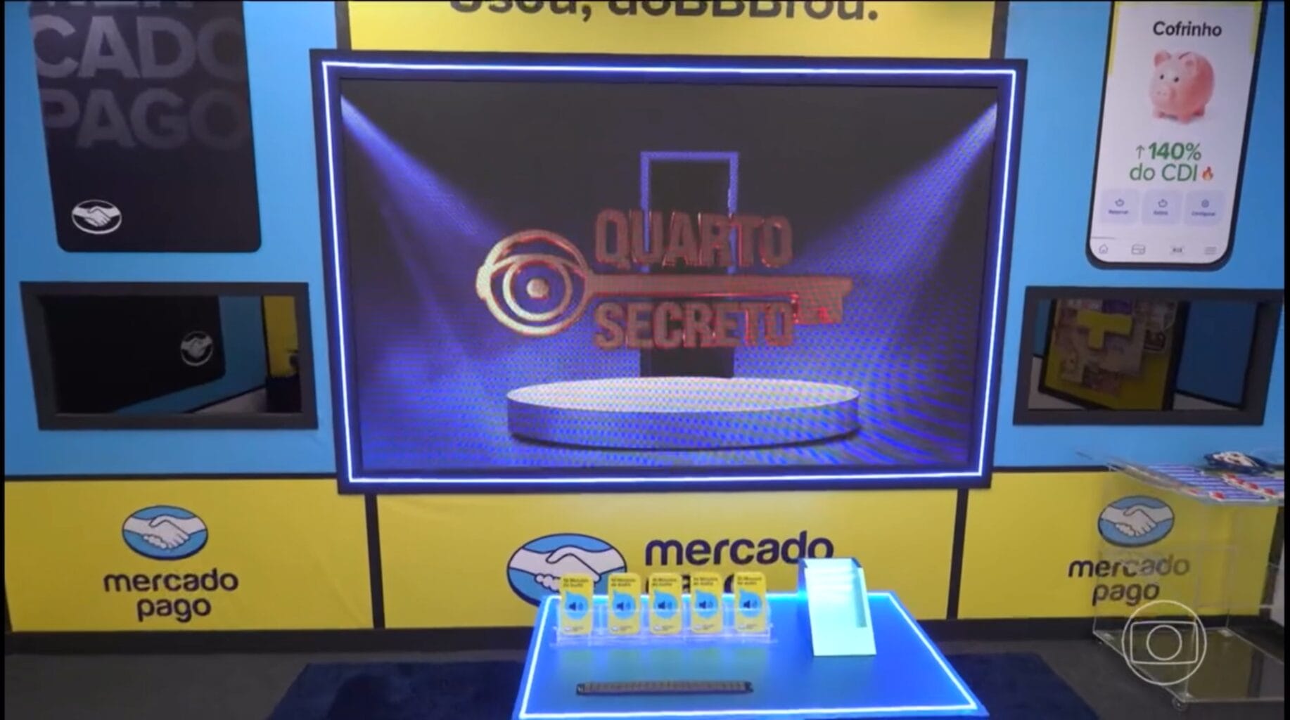 No Quarto Secreto ainda tem frigobar, potes com biscoitos, lixos e banheiro. O quarto é todo decorado com plotagens do patrocinador Mercado Pago. Quem for para lá, ainda vai poder sortear uma pessoa para passar um tempo lá dentro junto.
