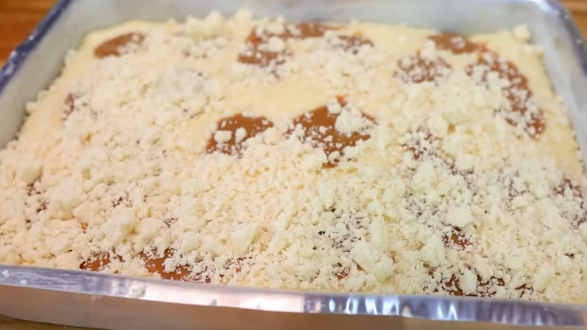 - Coloque pequenas porções de doce de leite na massa que estava reservada e espalhe a farofa por cima;