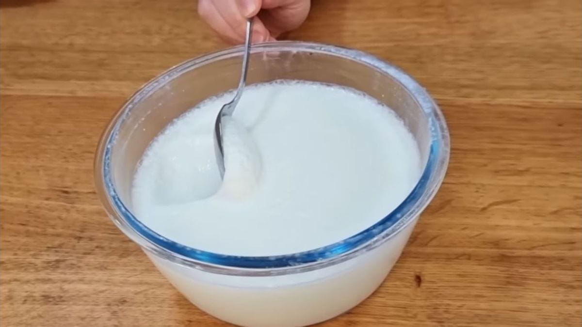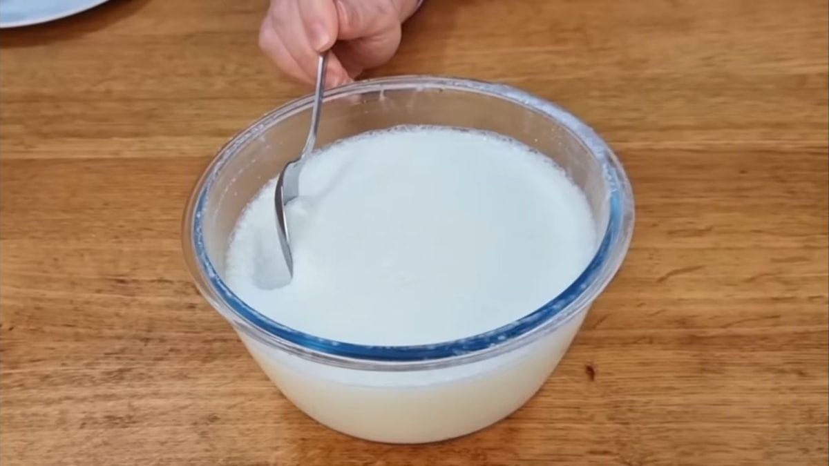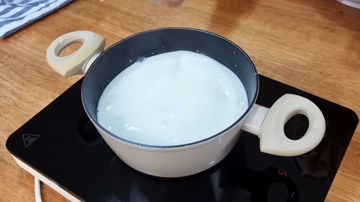 Primeiro, aqueça o leite em fogo médio-baixo em uma panela, mexendo para evitar nata no integral, até formar bolinhas nas bordas e soltar vapor. Desligue e deixe esfriar um pouco.