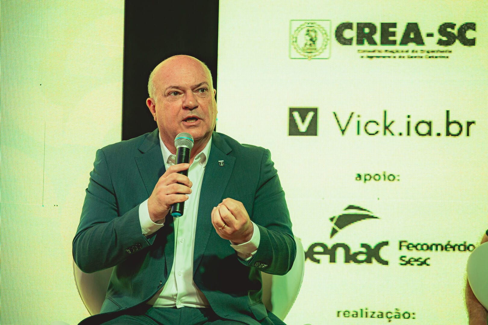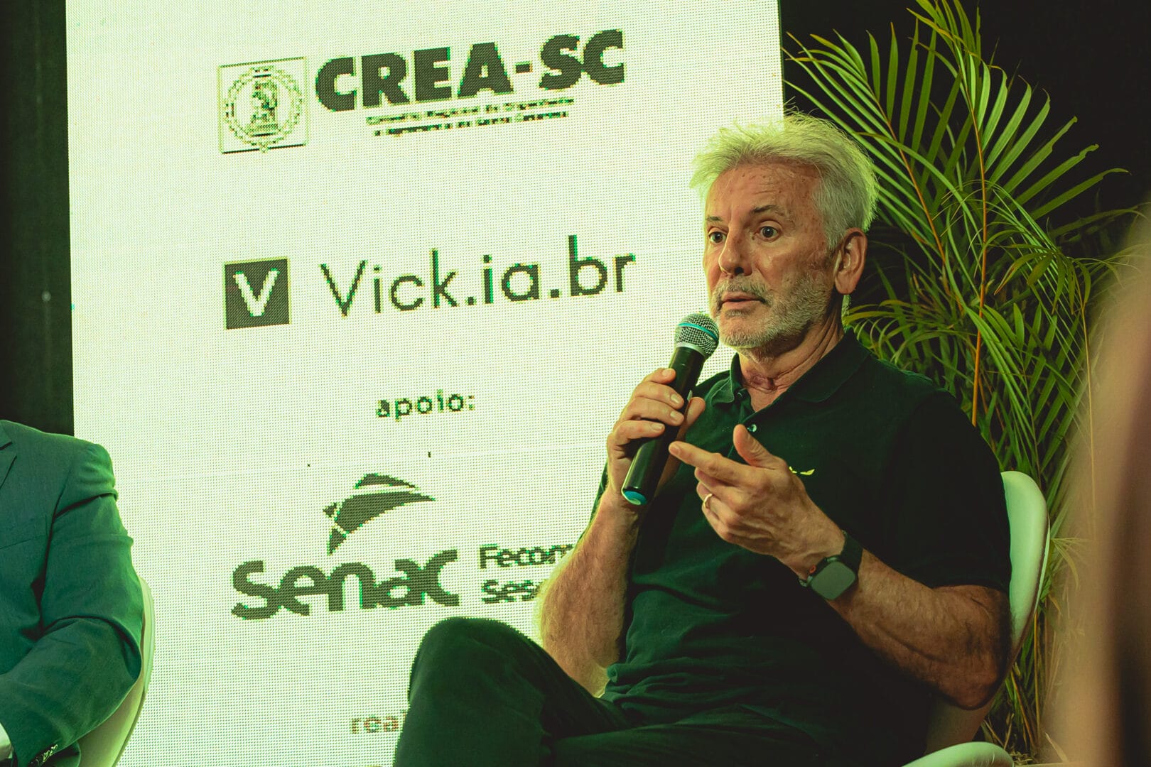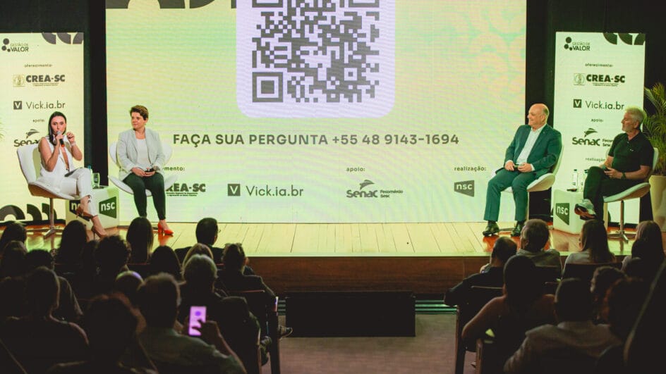 Mediado pela jornalista Eveline Poncio, o evento seguiu com um bate-papo sobre o tema, com a presença do presidente do CREA-SC, Eng. Kita Xavier, da analista de projetos empresariais do Senac SC, Juliana Camila Côco, além de Jaime. Os convidados abordaram a aplicação da IA na engenharia e no ensino acadêmico, e responderam a questionamentos dos participantes.