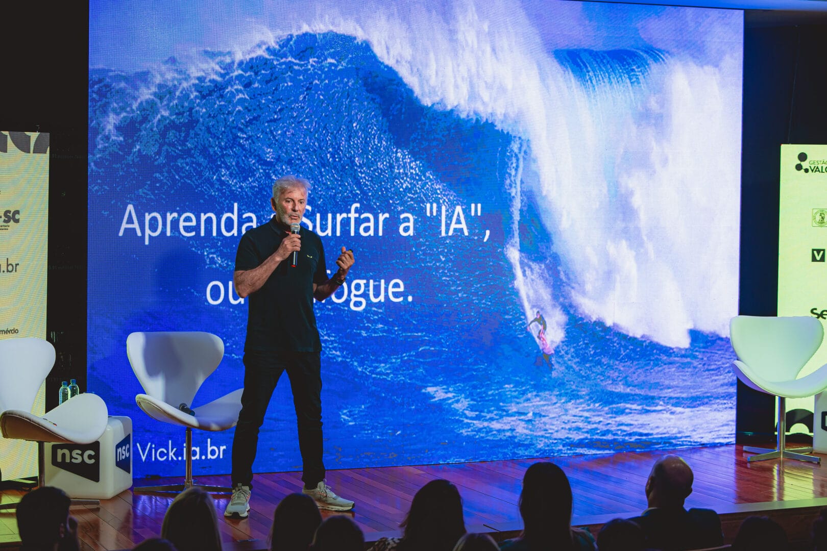 O encontro foi aberto por Jaime de Paula e Marcelo Barbosa, empresários do setor de tecnologia, com a palestra “Aprenda a surfar a IA ou se afogue”. Jaime e Marcelo são sócios da Vick, plataforma de inteligência artificial desenvolvida em Santa Catarina. Eles compartilharam dicas e aprendizados adquiridos com o uso da IA, além dos benefícios de sua implementação nas empresas.