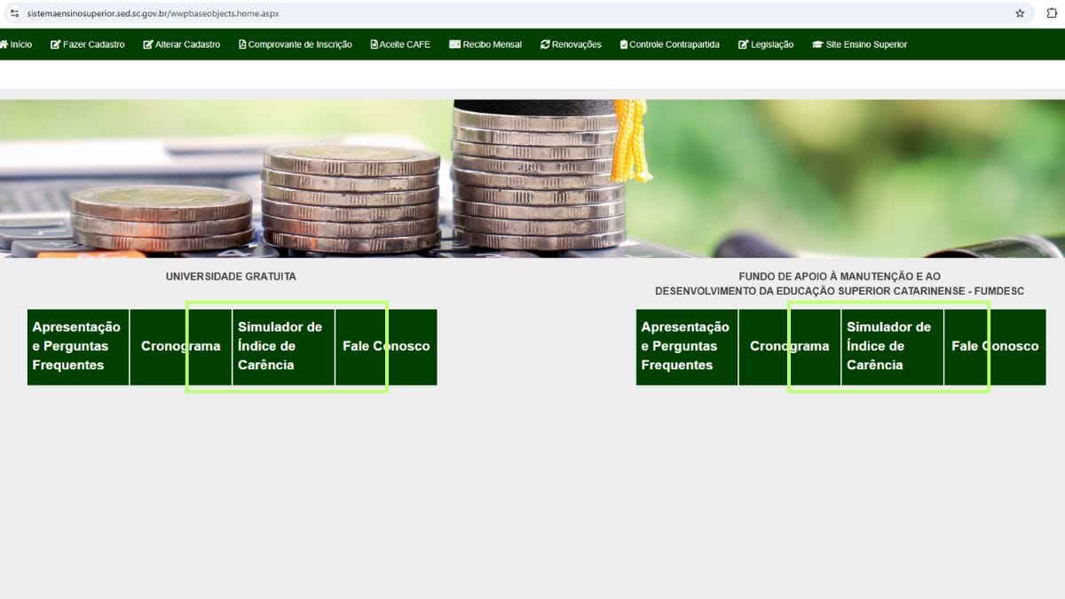 A Secretaria de Estado da Saúde lançou um simulador para que interessados calculem o seu índice de carência para uma eventual inscrição no programa Universidade Gratuita e nas bolsas de estudo do Fundo de Apoio à Manutenção e ao Desenvolvimento da Educação Superior Catarinense (Fumdesc).