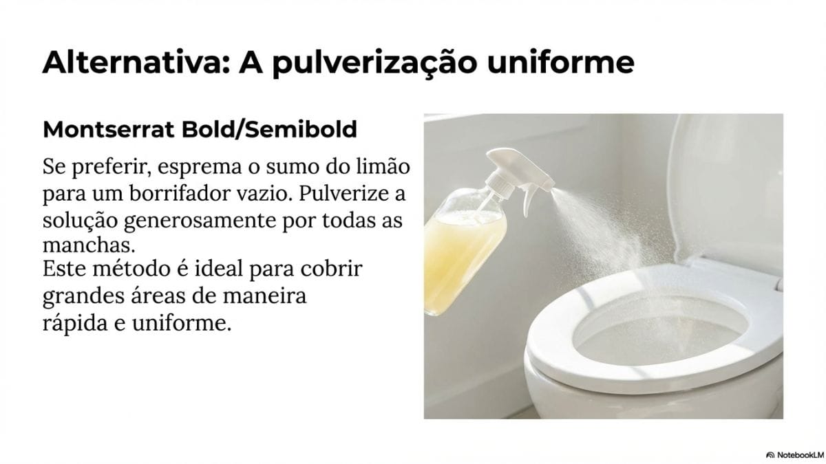 Se você preferir, você também pode colocar o suco de limão espremido na hora em um borrifador vazio e pulverizar a solução por todas as manchas. Este método alternativo é prático para cobrir grandes áreas com facilidade e de maneira uniforme.