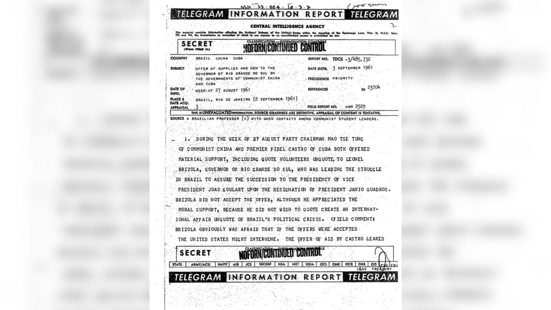 Um dos documentos aponta que, em agosto de 1961, o então governador do Rio Grande do Sul, Leonel Brizola, negou o apoio oferecido por Cuba e China.