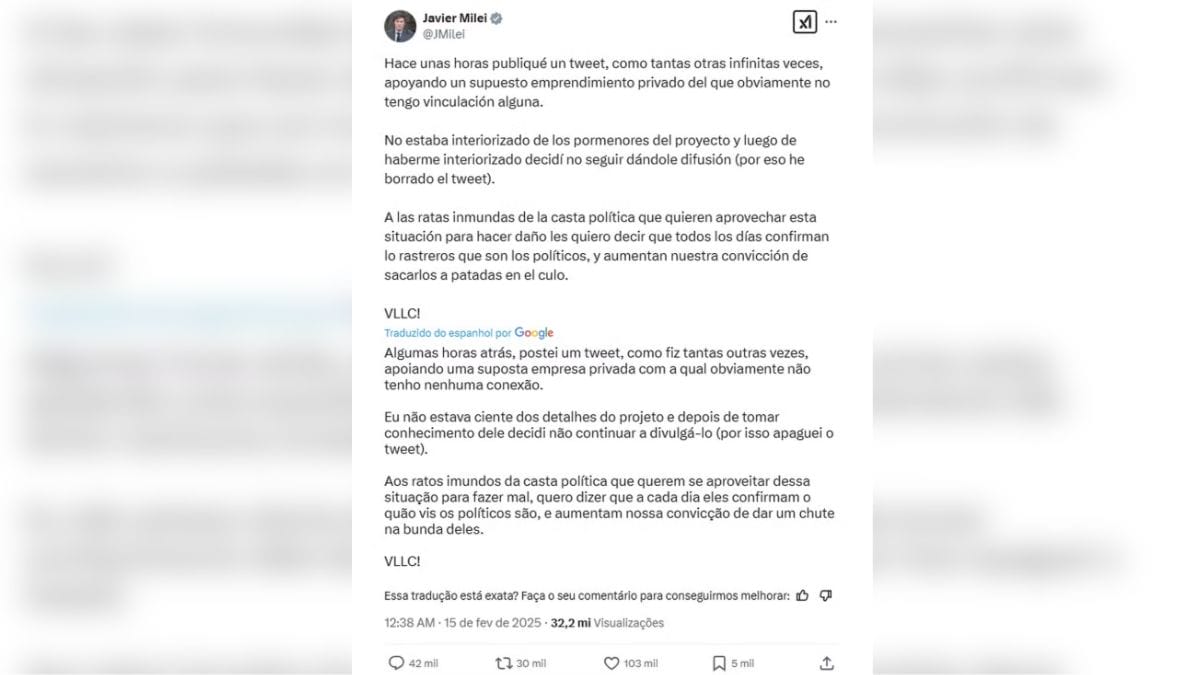 Após a polêmica, Milei apagou a mensagem na rede social e fez uma nova publicação, explicando que não estava ciente de detalhes do projeto e que não tinha vinculação com a criptomoeda.