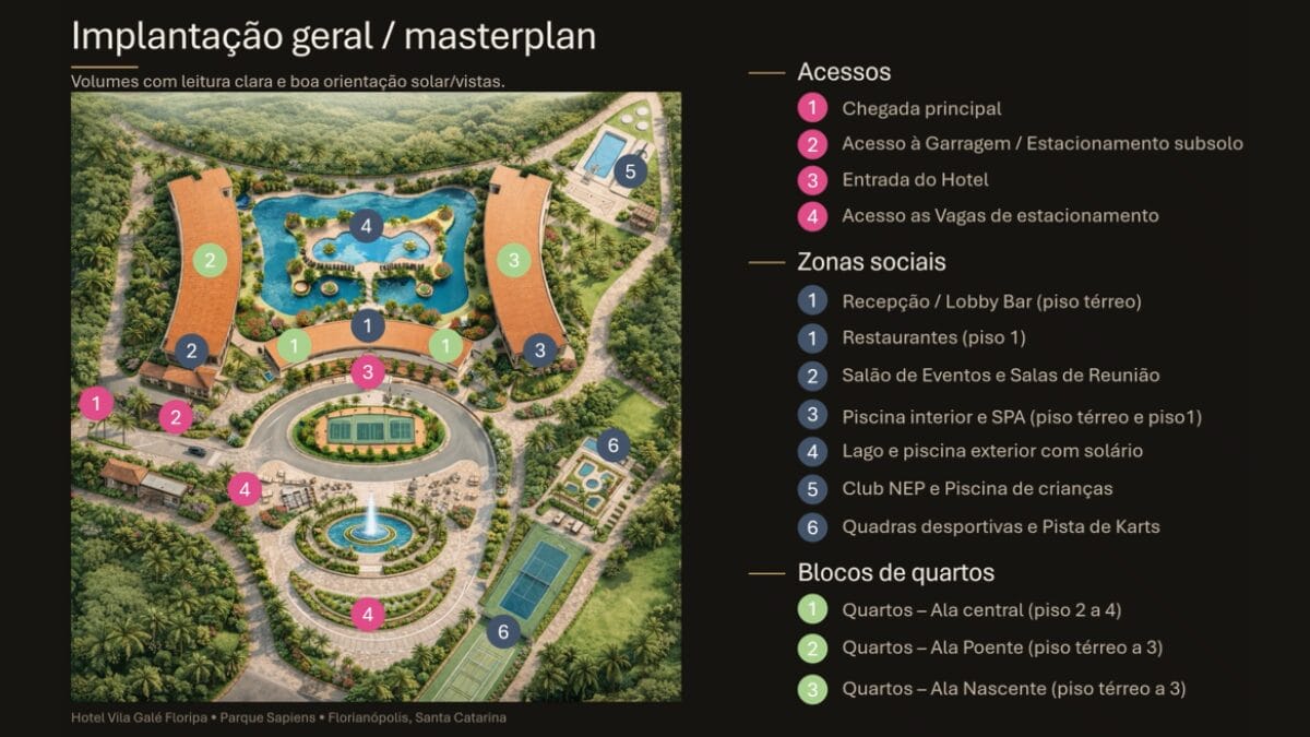 Com design moderno, o Vila Galé Floripa será construído em um terreno com 48 mil metros quadros no Parque Tecnológico Sapiens. O empreendimento contará com 308 apartamentos, lago e uma série de serviços e comodidades.