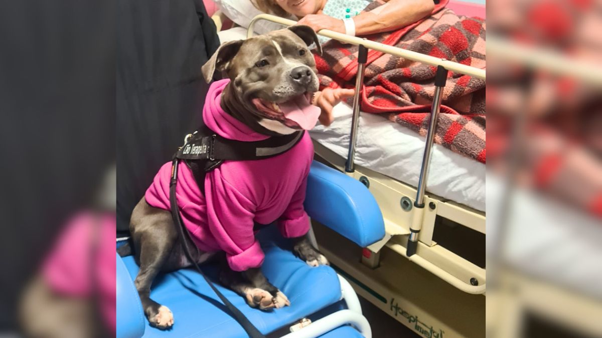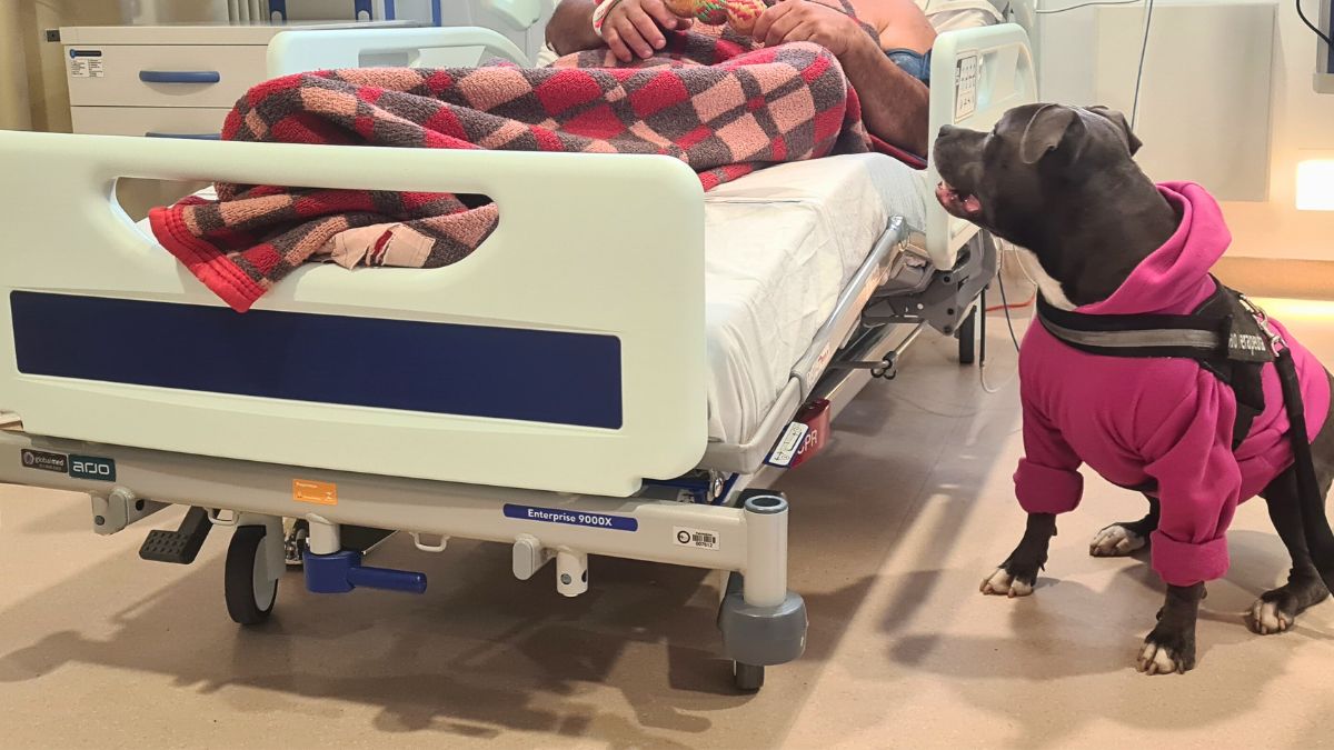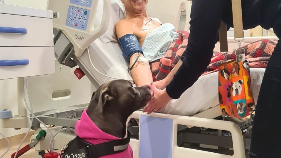 Ela veste colete e cumpre sua missão com dedicação exemplar. Moana, uma American Staffordshire Terrier atua com visitas no Hospital Nossa Senhora dos Prazeres, em Lages, e com a doçura de quem entende o sofrimento alheio, leva alegria, acolhimento e alívio emocional a pacientes, acompanhantes e profissionais da saúde.