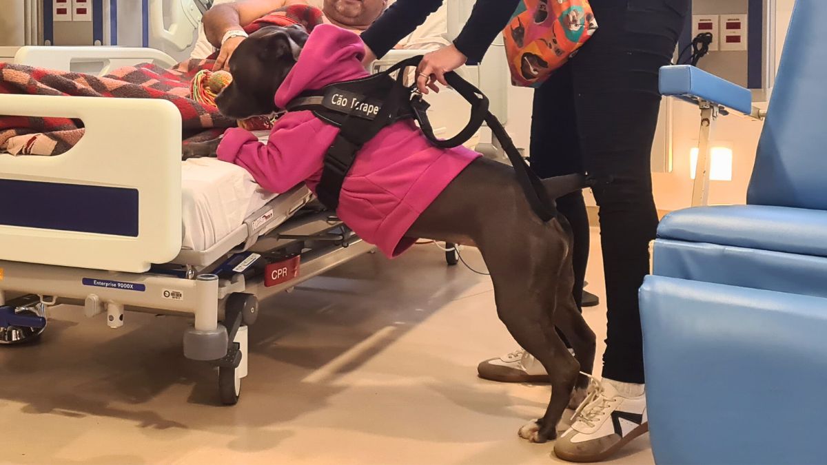 Ao vestir o colete, muda o comportamento e assume o papel de terapeuta. “Ela é uma cachorra normal em casa: corre, cava, brinca. Mas colocou o colete, ela se transforma. No hospital, ela entende que tem um trabalho. Ela até reconhece o caminho”, diz Giselle.