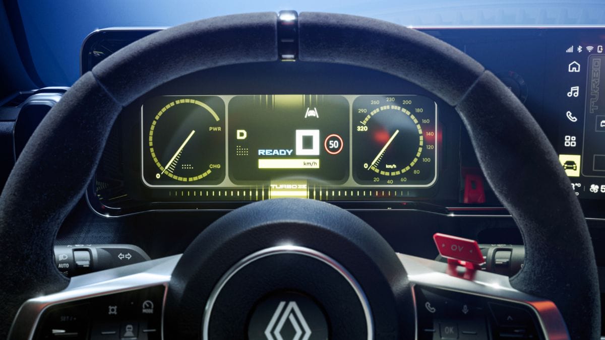 As telas OpenR de 10,1’’ e 10,25’’ oferecem informações de condução e navegação, homenageando os modelos originais Renault 5 Turbo. O sistema OpenR Link com Google integrado proporciona acesso a serviços como Google Maps, facilitando o planejamento de rotas elétricas.