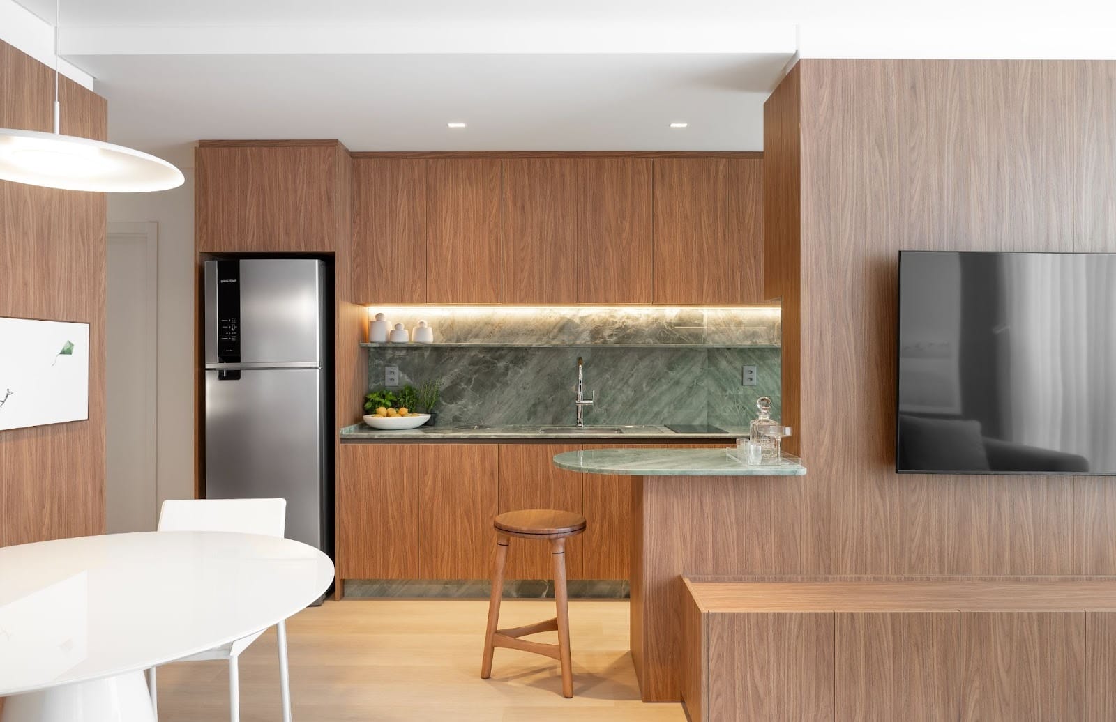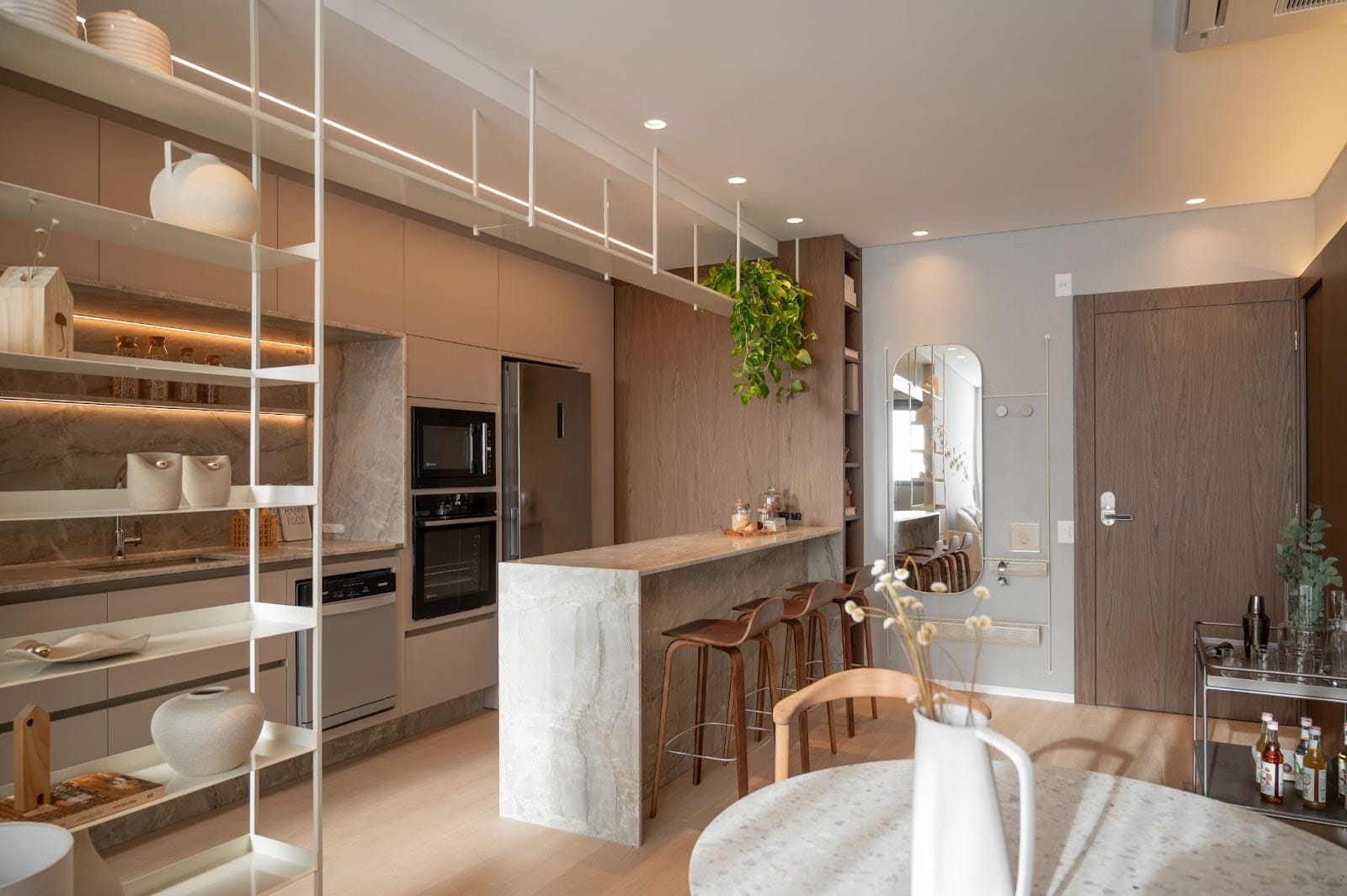 Por fim, o terceiro projeto, desenvolvido pelo escritório OSA Arquitetos, de Blumenau, explora a integração entre marcenaria, arquitetura e funcionalidade. Painéis de madeira funcionam como eixo que conecta diferentes áreas do apartamento, para criar continuidade estética. Volumes curvos, iluminação difusa, bancadas em pedras verde-claras e piso amadeirado estabelecem unidade visual e acolhimento sensorial. O foco está no equilíbrio entre textura, proporção e luminosidade.
