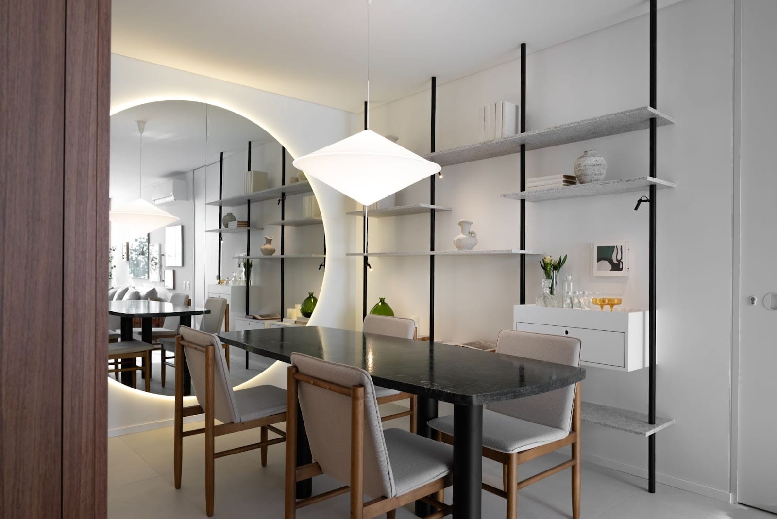 Espelhos posicionados de forma estratégica ampliam a sensação de profundidade e favorecem a continuidade visual entre os ambientes.A abordagem do escritório busca criar um espaço que possa se transformar conforme o morador.