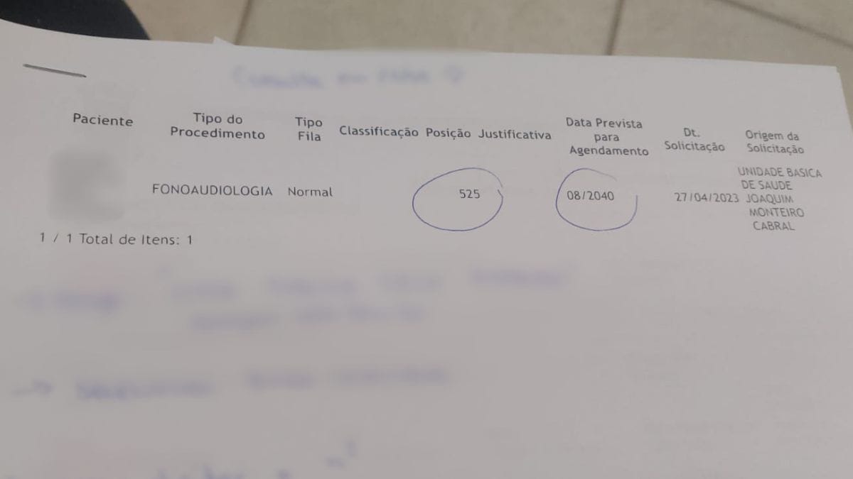 A espera por uma consulta de fonoaudiologia para uma criança de 10 anos gera revolta a uma família de Araquari, no Norte catarinense. Na última atualização recebida pela mãe, o menino aparecia na 525ª posição na fila de espera, com data prevista para agendamento em agosto de 2040.