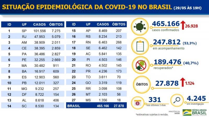 O boletim epidemiológico divulgado às 19h desta sexta-feira (29) pelo Ministério da Saúde informa 465.166 casos confirmados no país, dos quais 26.928 registrados nas últimas 24 horas, a maior marca desde o começo da pandemia. Foi o quarto dia consecutivo com mais de mil mortes.