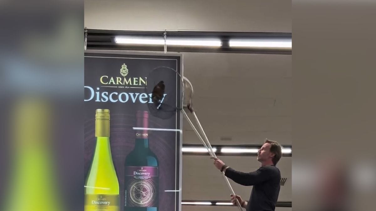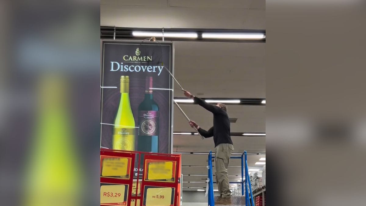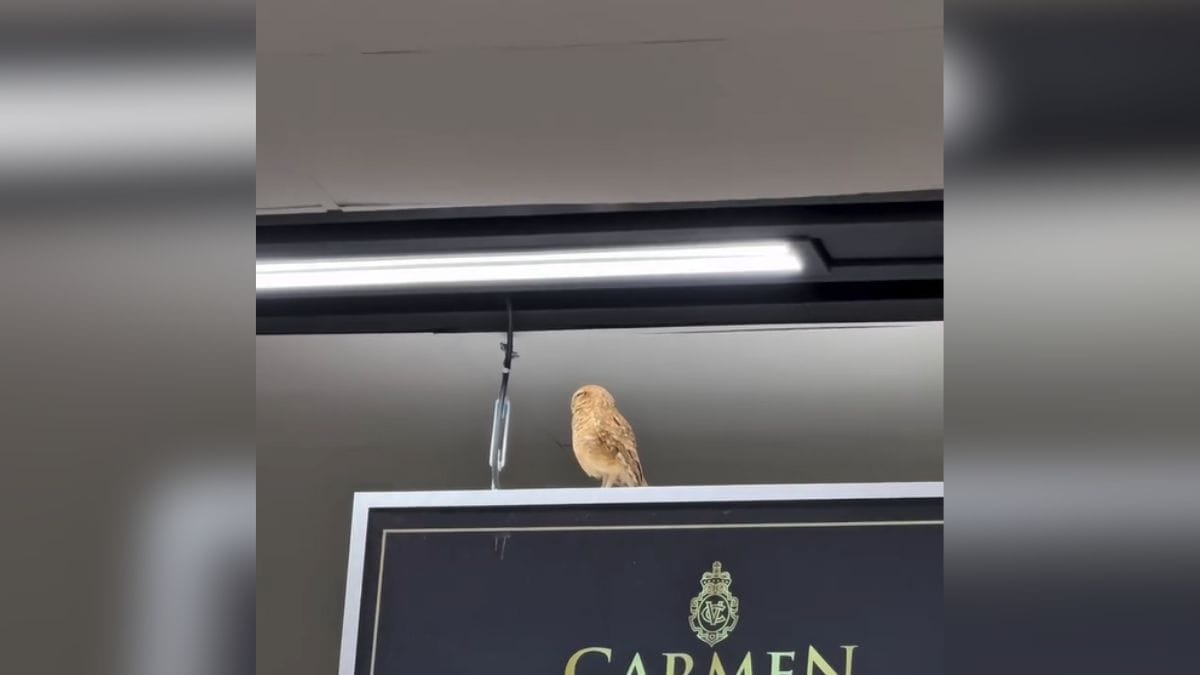Uma coruja-buraqueira invadiu um supermercado e chamou a atenção de clientes em Jaraguá do Sul, no Norte catarinense. O animal não conseguiu encontrar uma rota de saída e pousou em cima de uma placa de publicidade. O momento do resgate foi registrado pelo biólogo Christian Raboch Lempek e compartilhado nas redes sociais.