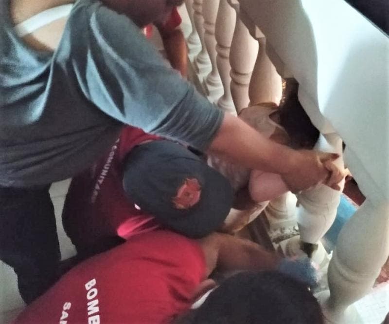 Susto para uma família de Penha, no Litoral Norte do Estado. Uma criança ficou com a cabeça presa no guarda-corpo de uma sacada, não conseguiu se soltar, e motivou o acionamento ao Corpo de Bombeiros na noite deste sábado (30).