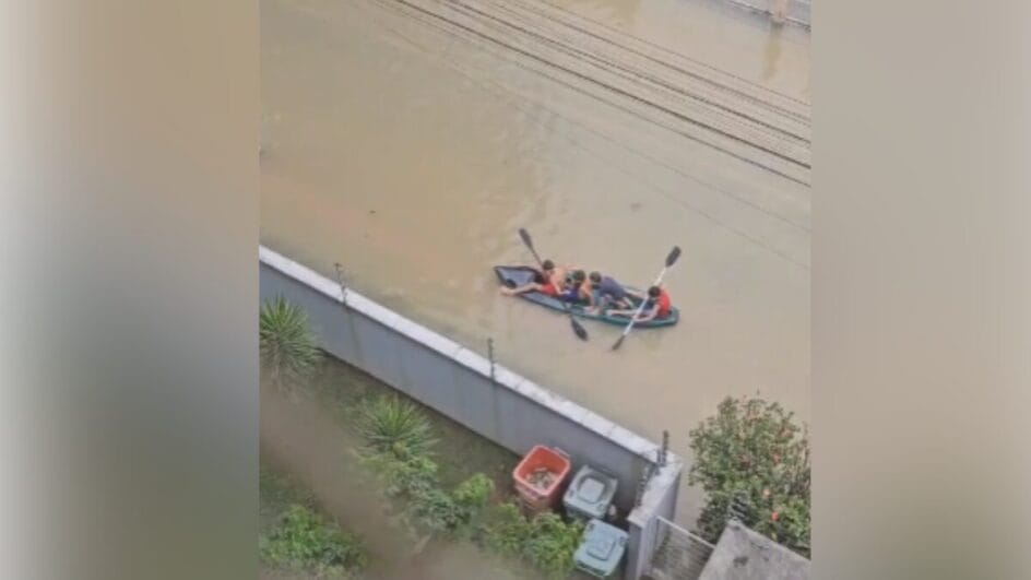 Um grupo de crianças foi flagrado brincando com um caiaque em meio a uma rua alagada no bairro Ponte do Imaruim, em Palhoça, na manhã desta sexta-feira (16). A filmagem mostra cerca de seis crianças “aproveitando” a água para navegar pelo bairro. Em outro momento, pedaços de MDF também são usados como pranchas pela garotada.