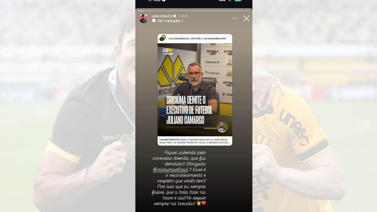 Nas redes sociais, Eder afirmou ter ficado sabendo do desligamento pela internet. “Esse é o reconhecimento e respeito que vocês têm! Por isso eu sempre falei que a bola bate na trave e sai. Vou seguir sempre na torcida”, escreveu.
