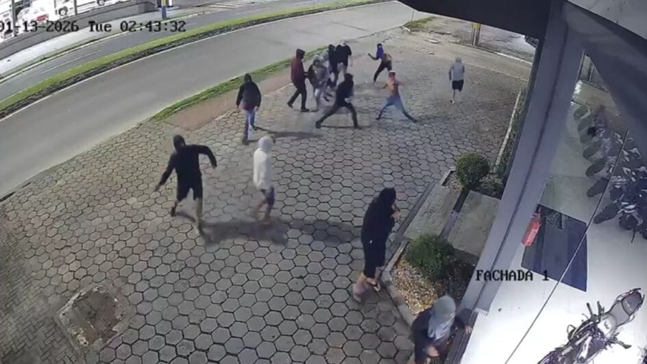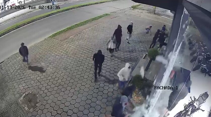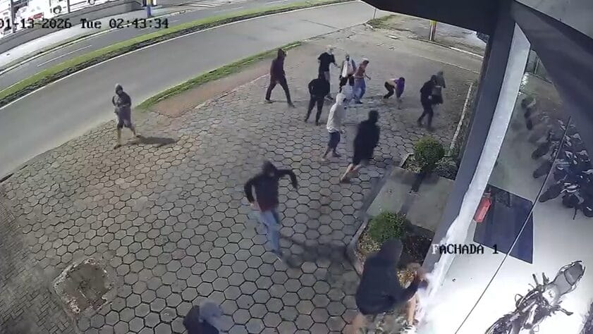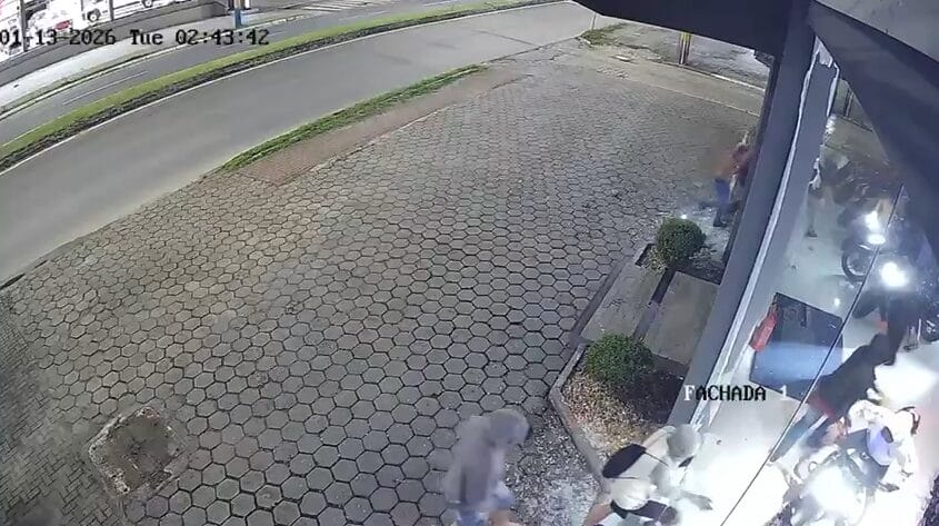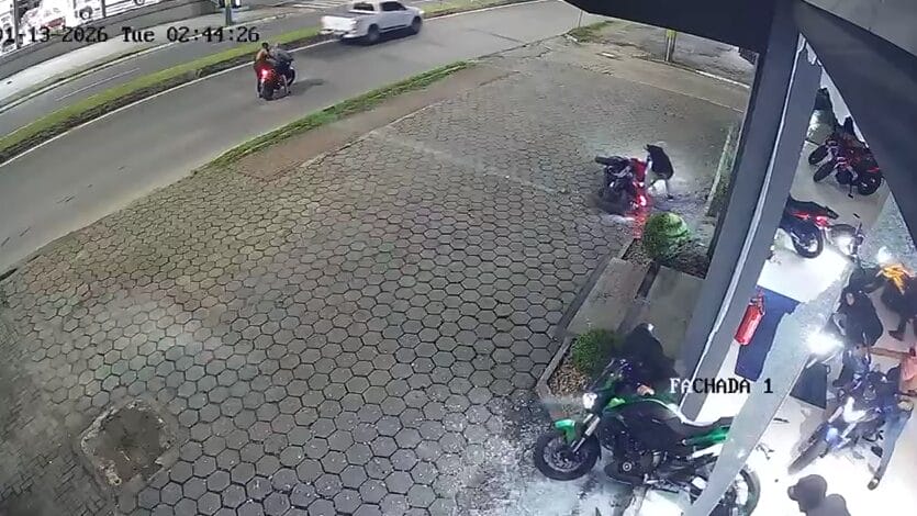 Um grupo formado por mais de 10 homens deu pedradas nos vidros de uma loja de motocicletas, invadiu o lugar e fugiu levando alguns veículos. O crime ocorreu na madrugada desta terça-feira (13) em Itajaí, mas a fuga continuou por cidades vizinhas como Camboriú e Balneário Camboriú.