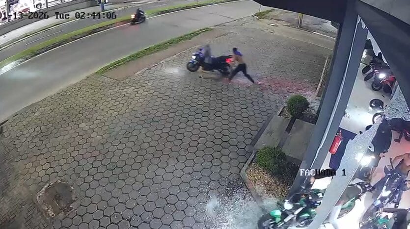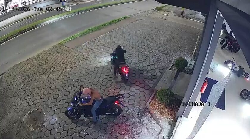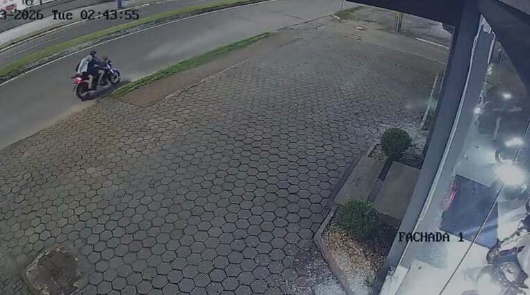 Uma câmera de segurança flagrou a ação (veja abaixo). Os criminosos chegaram com os rostos cobertos e jogaram pedras na revenda da Avenida Osvaldo Reis para romper o vidro. Rapidamente eles entram, ligam as motos expostas e saem com 12 delas. Alguns se atrapalham com o peso dos veículos e têm dificuldade para deixar o estabelecimento, mas logo conseguem.