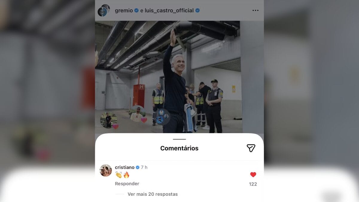 O Grêmio publicou na última semana, em conjunto com Luís Castro, uma foto da chegada do treinador a Porto Alegre e à Arena. Um dia depois da publicação, Cristiano Ronaldo comentou com emojis de fogo e palmas.