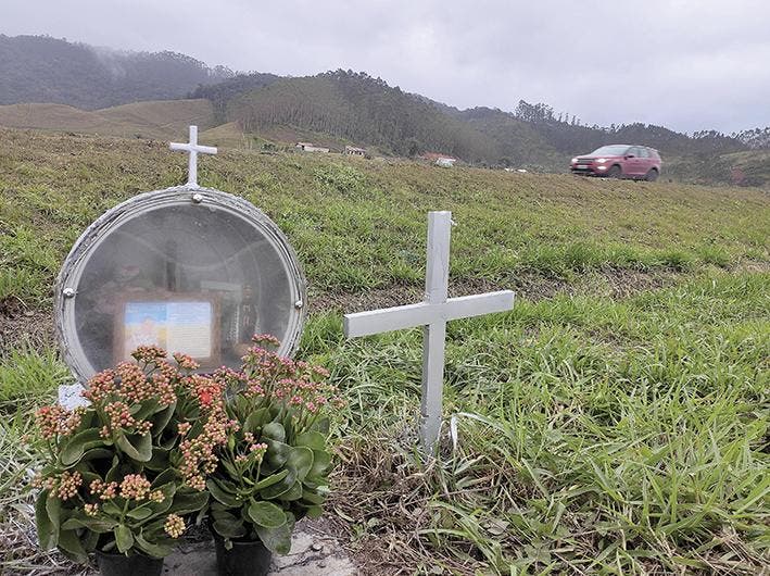A garoa fina que cai sobre o asfalto na manhã de um sábado chuvoso não inibe os motoristas de aproveitarem o trecho duplicado da BR-470, em Gaspar, e pisar mais fundo no acelerador. Uma movimentação atípica na vala que divide as quatro pistas, porém, chama a atenção mesmo dos mais apressados: um casal e uma mulher com um bebê no colo mexem em uma pequena capela disposta ao lado de uma cruz. O material prateado, recém-pintado, ganha destaque entre a frieza cinzenta do asfalto.