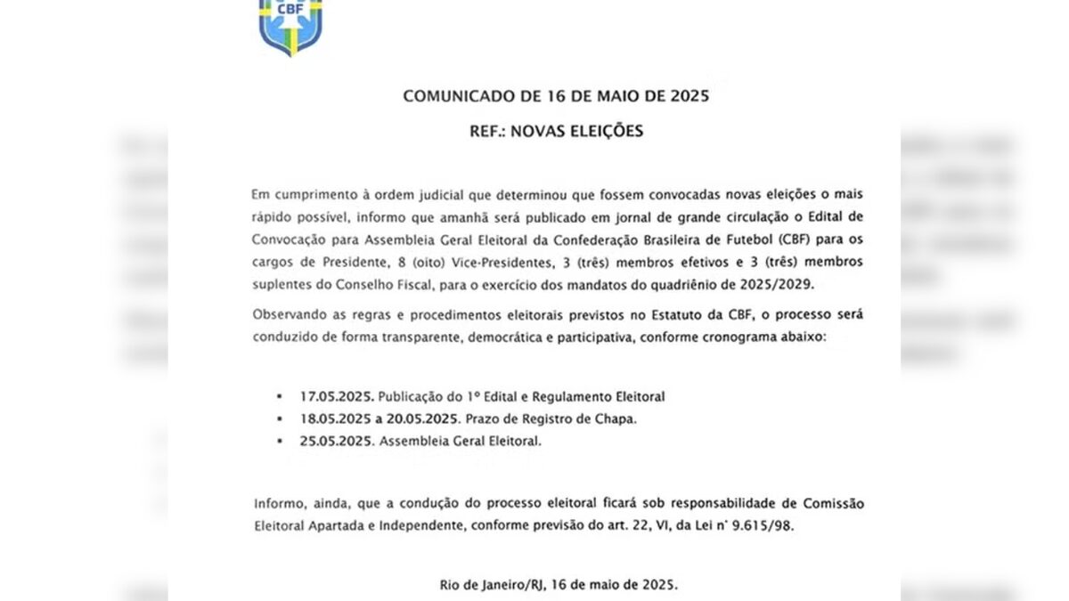 O edital para as chapas se registrarem será publicado neste sábado (17) e aceitará envios entre os dias 18 e 20 de maio, de domingo até terça feira. As eleições para novo presidente da CBF devem acontecer no dia 25 de maio, domingo. O período de mandato do quadriênio é de 2025 a 2029.