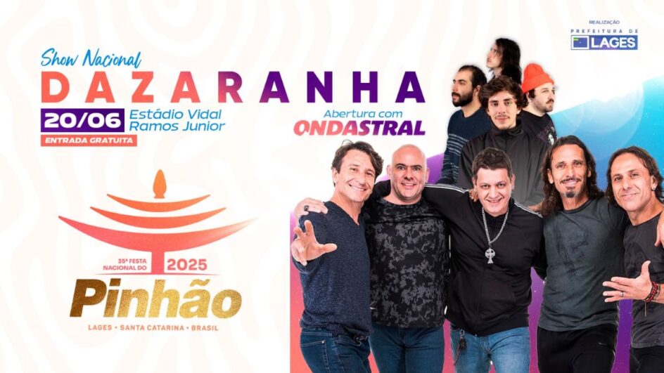 Na terceira noite de shows gratuitos da 35ª Festa Nacional do Pinhão, o Estádio Vidal Ramos Júnior (Tio Vida) será o palco do som autêntico da banda Dazaranha e da lageana Ondastral. As duas bandas se juntam a Yasmin Santos, Fernando & Sorocaba e Guilherme & Benuto como atrações principais da festa.