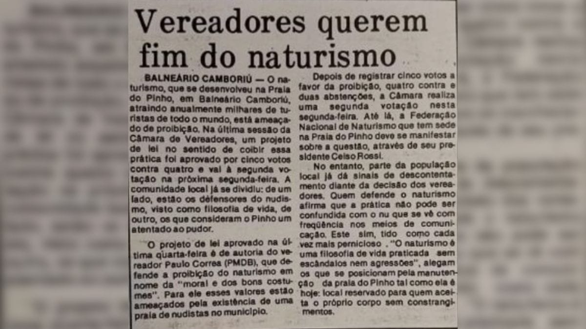 Apesar de há quase meio século a Praia do Pinho ser voltada aos adeptos do naturismo, só em 2006 isso foi regulamentado efetivamente através de Plano Diretor de Balneário Camboriú. Mas desde então havia movimento contrário, como mostra um jornal da época (abaixo). Agora, passados quase 20 anos, o documento passou por revisão e foi tirado a indicação de que a área era para pratica de nudismo.